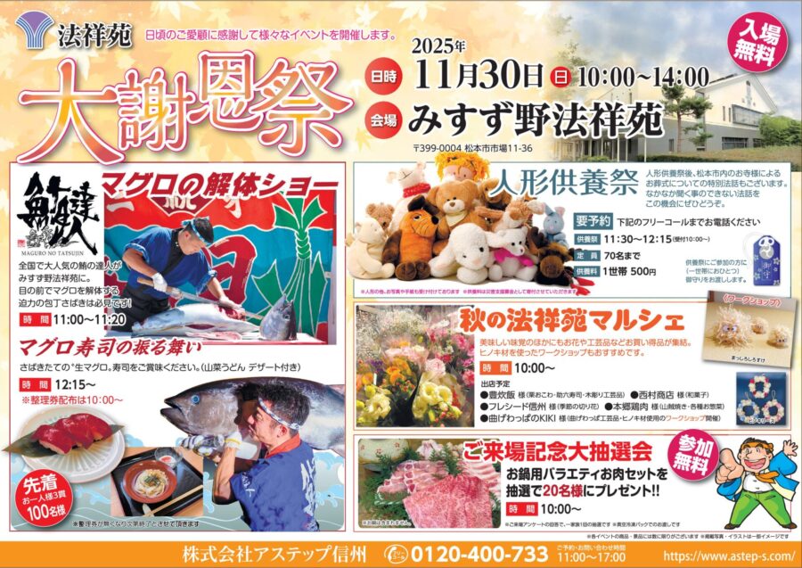 11/30(日)みすず野法祥苑(松本市市場)で大謝恩祭を開催します!人形供養祭をはじめ、大人気のマグロ解体ショーや写真撮影会、お子様も楽しめるイベントも開催。豪華賞品がプレゼント!ご来場記念の大抽選会など、皆さんで盛り上がれるイベントも盛りだくさんです。ぜひご家族皆さんでご来場ください。